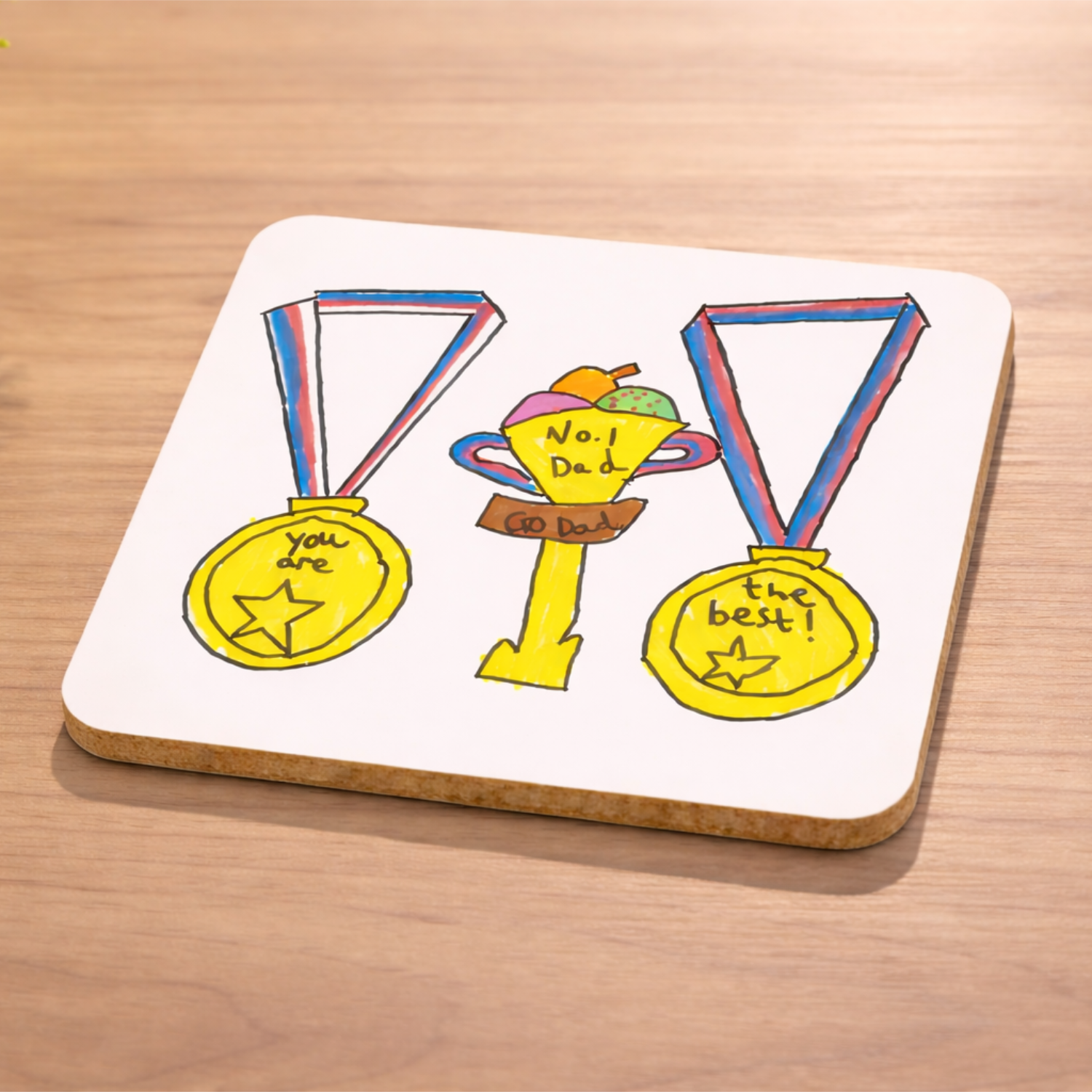 Square wipe clean coaster with red felt backing, featuring each child’s design. The brighter the design, the more they shine! 9cm square.